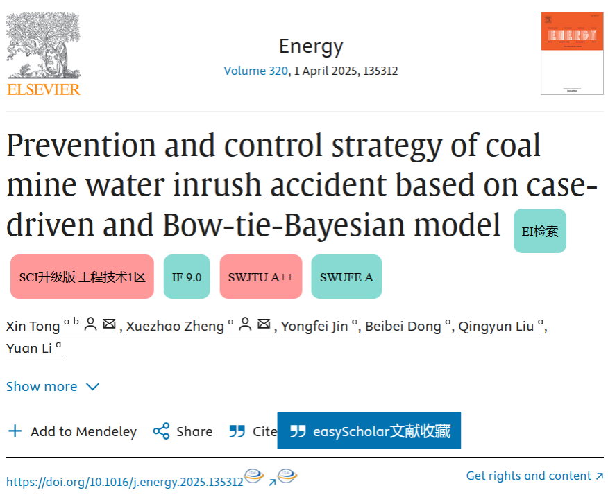 近日,beat365vip官网登录入口青年教师童鑫与其合作者正式在国际能源科学权威期刊《Energy》上发表了题为“Prevention and control strategy of coal mine water inrush accident based on case-driven and Bow-tie-Bayesian model”的研究论文,童鑫为该论文的第一作者兼通讯作者。