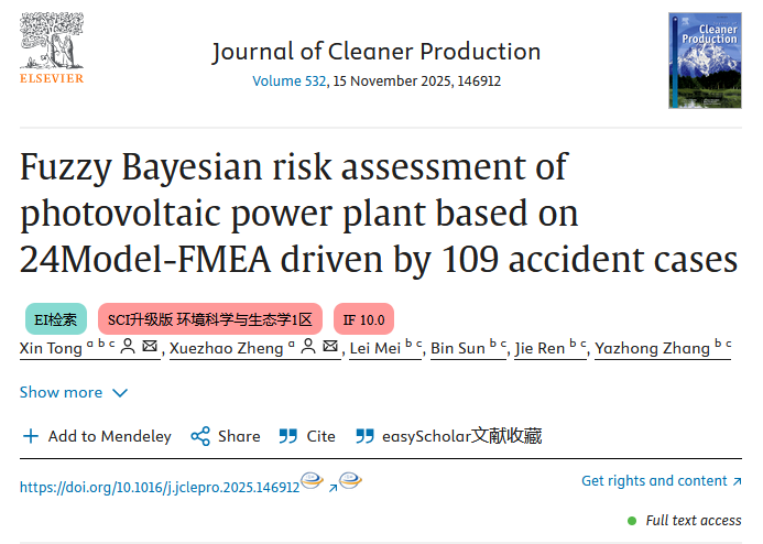 近日,beat365vip官网登录入口应急管理系骨干教师童鑫在工程环境与可持续发展领域取得新突破,相关成果“Fuzzy Bayesian risk assessment of photovoltaic power plant based on 24Model-FMEA driven by 109 accident cases”发表于国际TOP期刊《Journal of Cleaner Production》。教师童鑫为论文的第一作者兼通讯作者。