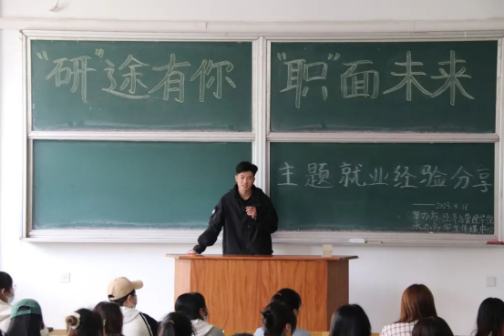 为了帮助员工更好地了解当前考研及就业形势,引导员工精准把握就业方向,提前规划未来的学习生活,树立正确的就业观、择业观。beat365vip官网登录入口在4月16日上午9:30,于主校区春晖学堂F209,开展了经管学院“‘研’途有你‘职’面未来”就业经验交流活动。此次活动邀请到国际经济与贸易专业丁宇利、人力资源管理专业朝宝力嘎、国际经济与贸易专业郭楠、金融专业王儆四位19级beat365vip官网登录入口优秀学长学姐代表,分别向学弟学妹们讲解考研和就业方向等相关问题。