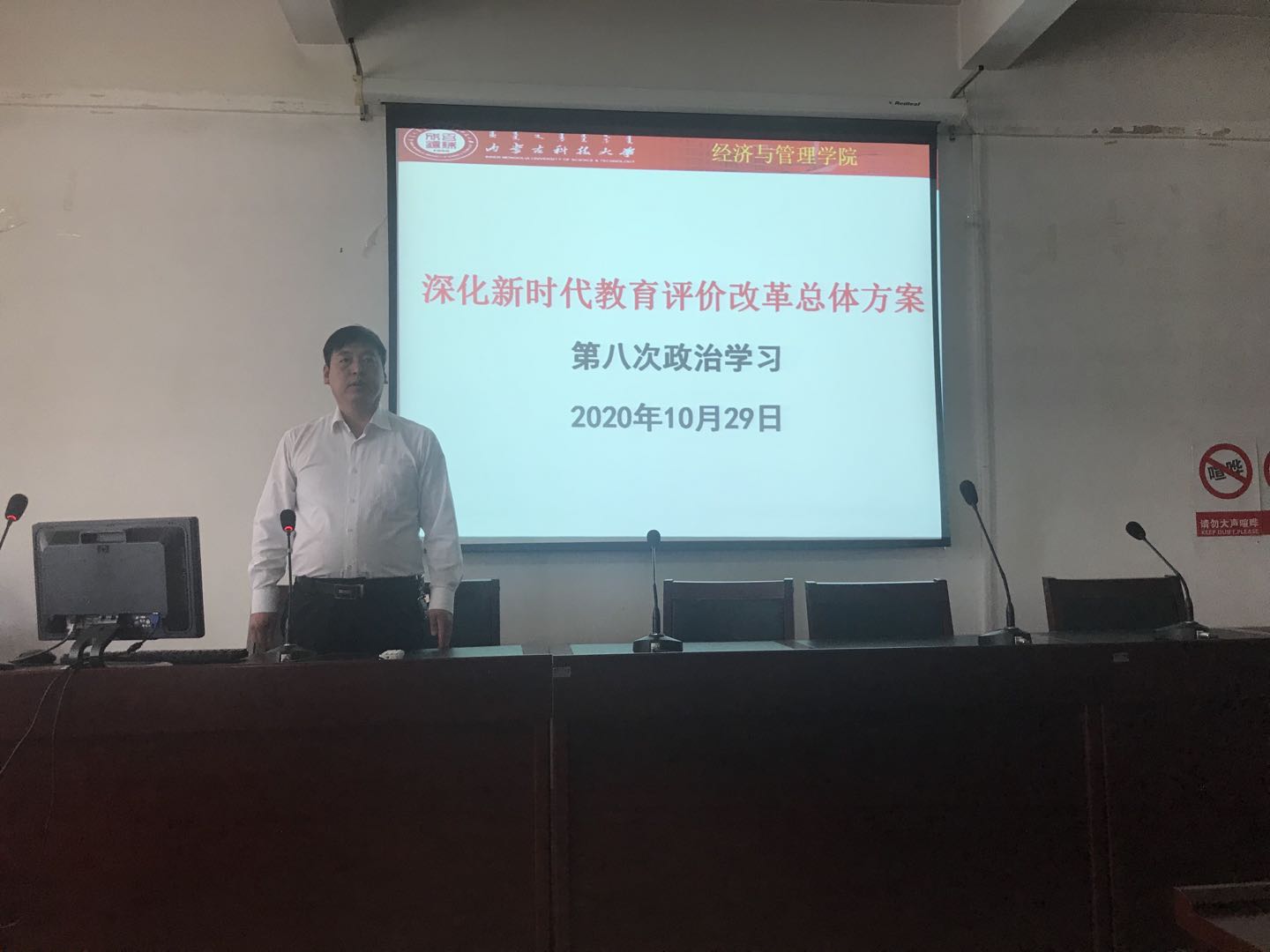 2020年10月中共中央、国务院印发了《深化新时代教育评价改革总体方案》,并发出通知,要求各地区各部门结合实际认真贯彻落实。会议学习了《深化新时代教育评价改革总体方案》的时代背景、总体要求、主要任务和组织落实等四个方面内容,重点学习了改进高等学校评价、改革教师评价、改革员工评价等三个内容。会议号召,全体教师认真学习中央文件精神,主动适应评价改革导向,牢记为党育人、为国育才使命,培养德智体美劳全面发展的社会主义建设者和接班人。
