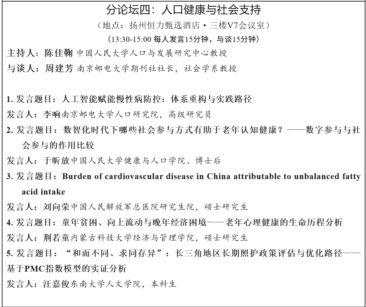 论文设置八个平行分论坛,涵盖数智化驱动下的人口高质量发展、大数据支撑下的“投资于人”健康服务体系、大运河健康共同体建设、人口健康与社会支持、产业变革与健康治理、健康老龄化与银发经济、代际变迁中的“新中年”“新老年”与“青少年”研究、生育支持政策与生育友好型社会建设等议题。与会学者围绕数智技术与人口服务、老年健康、生育支持、延迟退休、银发经济等热点难点问题展开深入研讨,形成了一批兼具理论创新与实践指导价值的学术成果。
